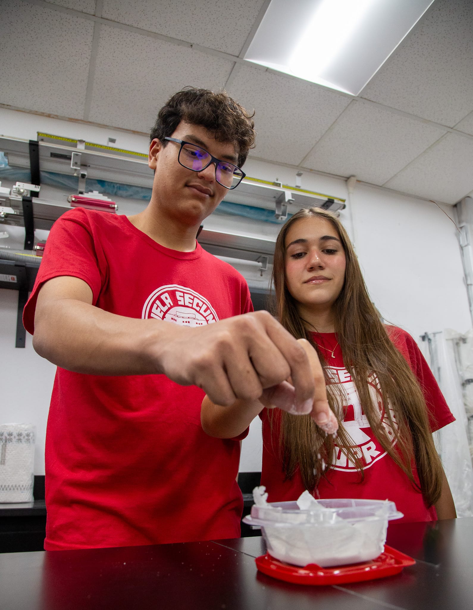 · Sergio Torres Rosa y Leila Molina Almeida estudiantes de la Escuela Secundaria de la UPR colaborando en el proyecto NASA TechRise Student Challenge