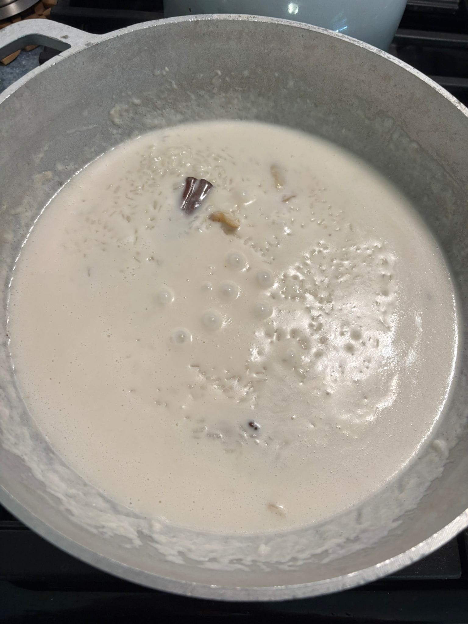 - Escurrir bien el arroz y añadir a la leche, mezcla, cocinar a fuego moderado hasta que hierva …bajar fuego, y tapar. Cocinar tapado hasta que arroz este cocido completamente, 10-15 minutos.