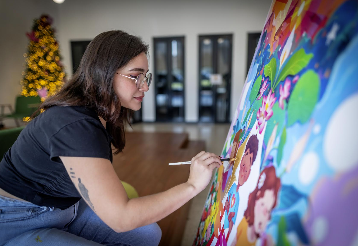 El artista Lex Tirado planteó por su parte que “la causa de la niñez es extraordinaria. En mi carácter de artista trato de colaborar en proyectos que busquen el bienestar común pero cuando se trata de niños y jóvenes tiene más peso porque son nuestro futuro. Lo que vivimos con la violencia a nivel mundial y en la Isla nos abruma. Así que es importante que se conozcan muchas iniciativas como esta que te dan paz. Hay mucho temor en la vida, pero también hay esperanza y fe que podemos compartir. Lo demostramos con este junte de 10 artistas que creemos en este proyecto. Todos somos buenos pero juntos somos mejores”. Tirado explicó que “la obra que estoy presentando se llama “Marlene la guardiana”. Las mujeres son piezas centrales en mi temática. Marlene es la mujer protectora, cuidadora y guía que se sostiene entre proteger la niñez y la naturaleza. En la obra hay duendes y hadas que representan la imaginación infantil, la importancia de preservar la inocencia. La obra Marlene, aunque no presenta un niño, en realidad está hecha desde la mirada de un niño. Es mi perspectiva del niño que contempla a la mujer protectora, disfruta la imaginación y la inocencia de la niñez”.