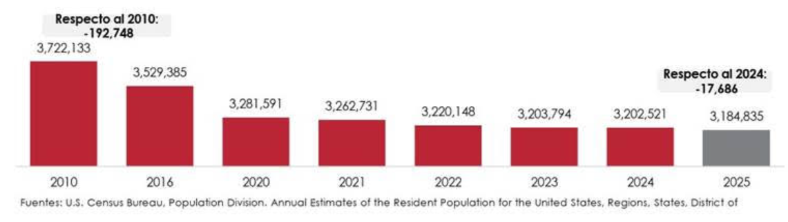 La población total residente se redujo a 3,184,835 habitantes, de 3,202,521 personas en el 2024. Entre el 2010 y el 2025 se dio una reducción notable en población de 537,298 personas, reflejando tanto el cambio natural en la población como la emigración neta.